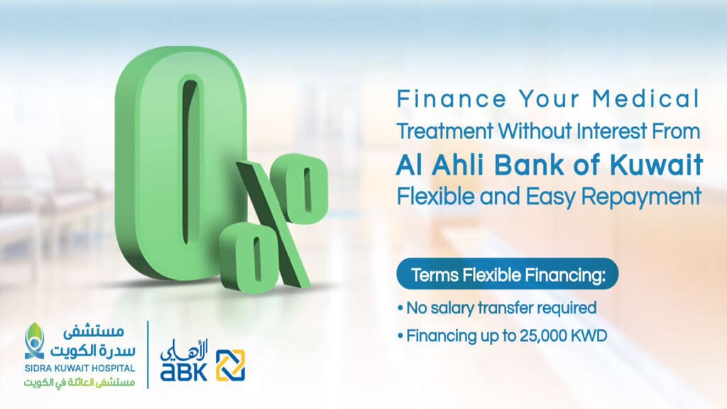 Sidra Kuwait Hospital, in collaboration with Al Ahli Bank of Kuwait (ABK), offers 0% interest financing to cover your medical treatment costs. Enjoy flexible repayment options without the need for salary transfer, with financing available up to 25,000 KWD. This initiative ensures patients can access high-quality healthcare with ease and financial comfort.